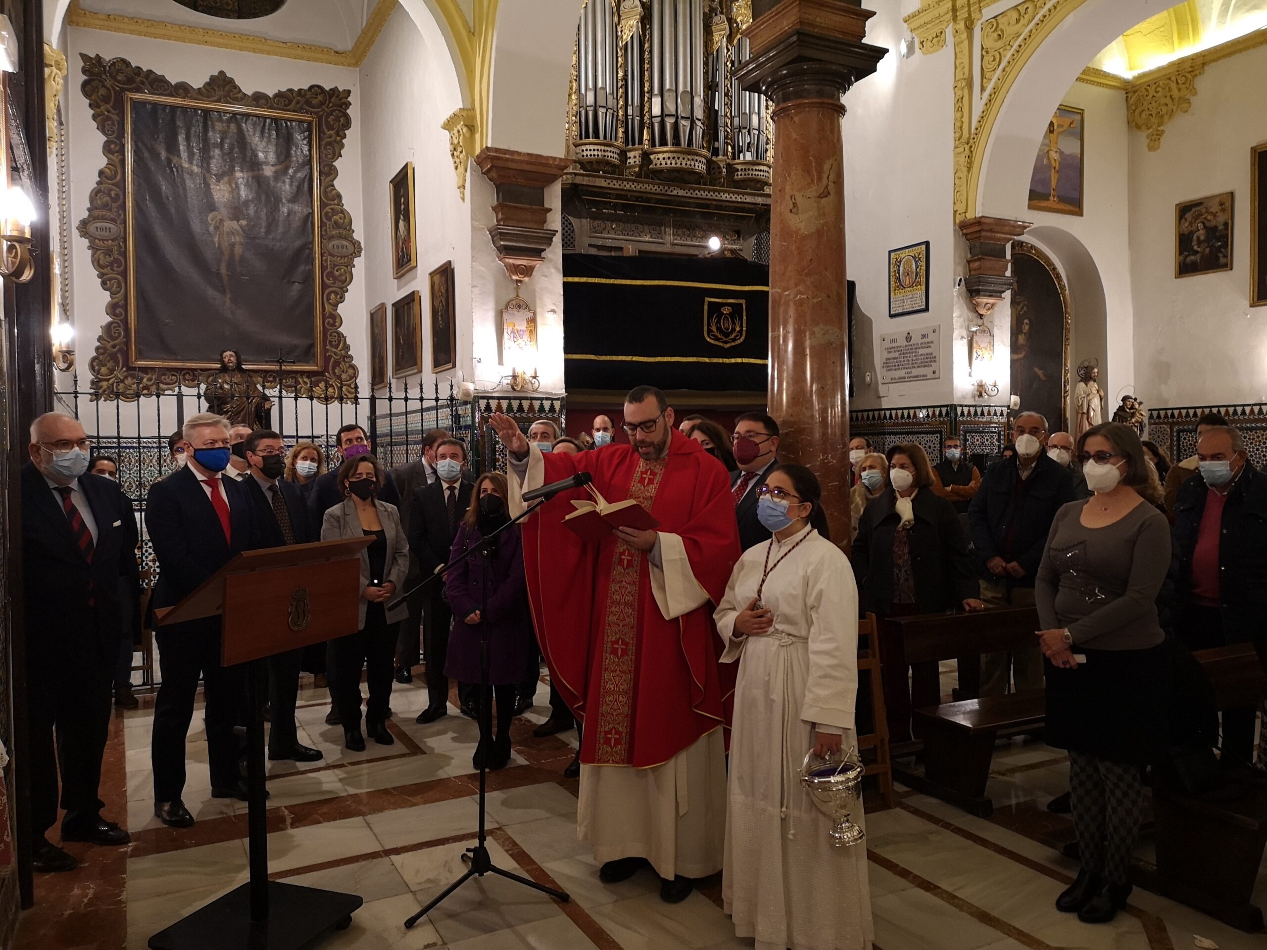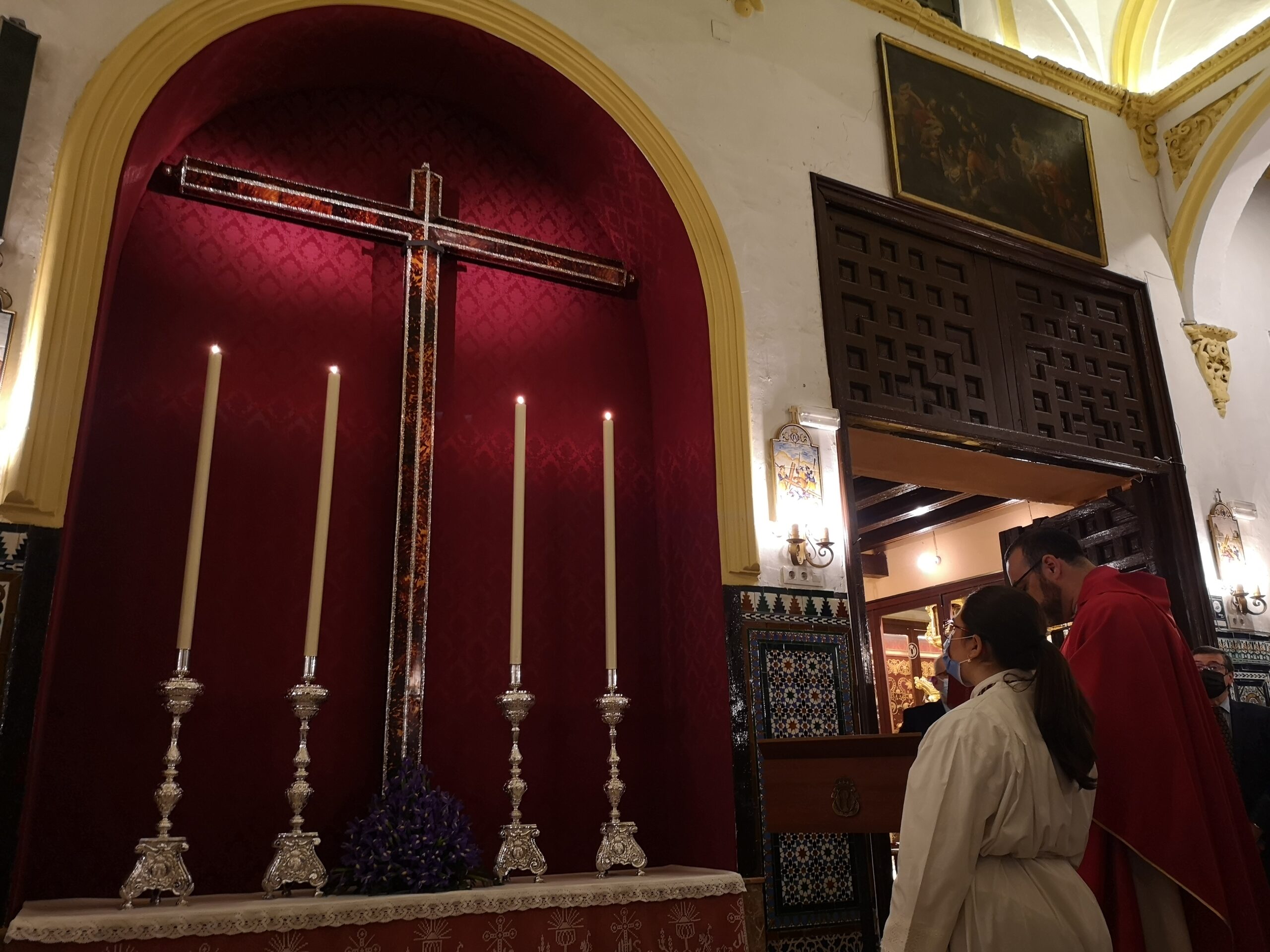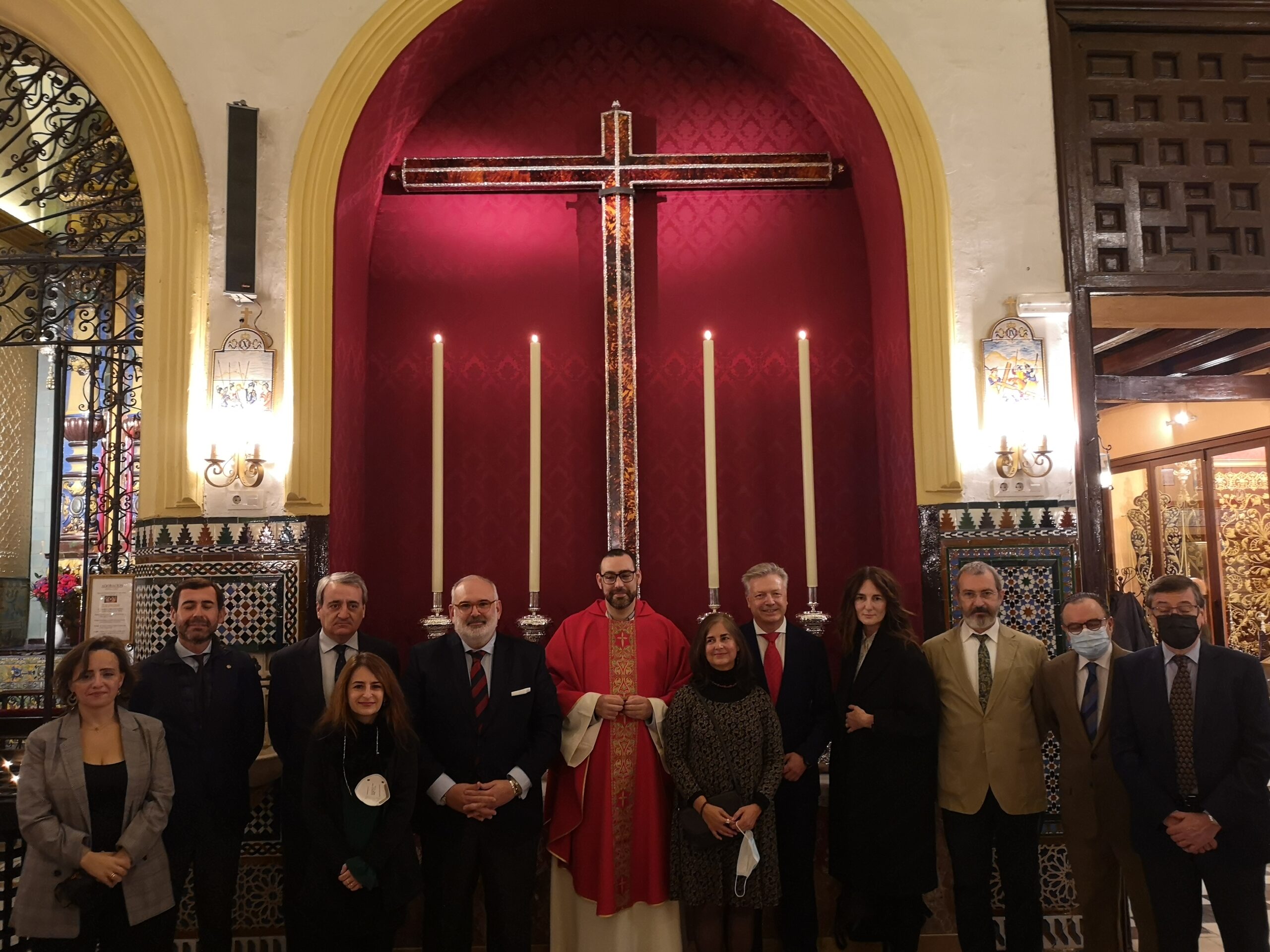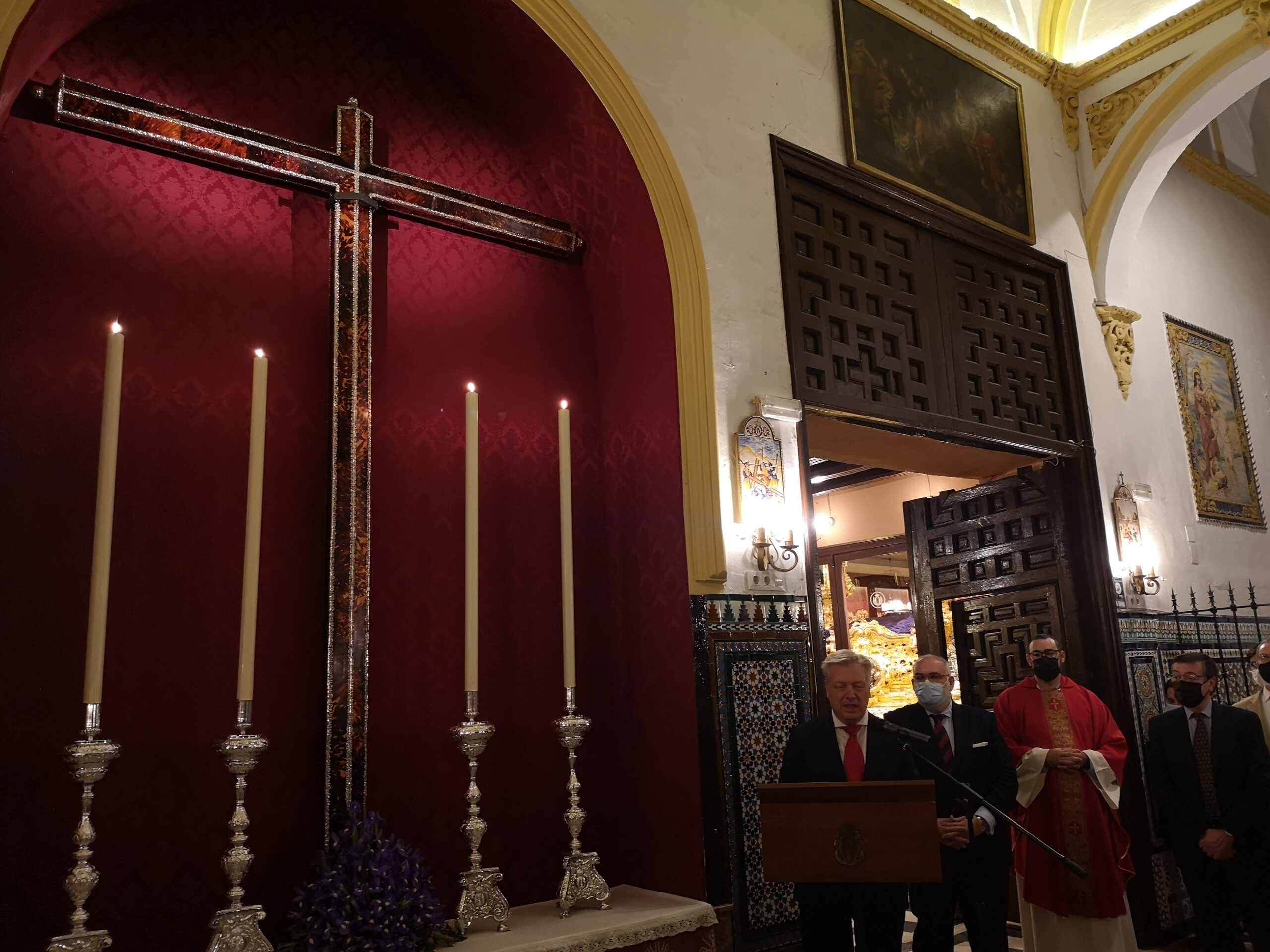 conservación y restauración que se han llevado a cabo sobre la cruz, la señora Directora General del Distrito de Triana, y los señores delegados del Viernes Santo Tarde y el de Hermandades Sacramentales del Consejo General de Hermandades y Cofradías de Sevilla.