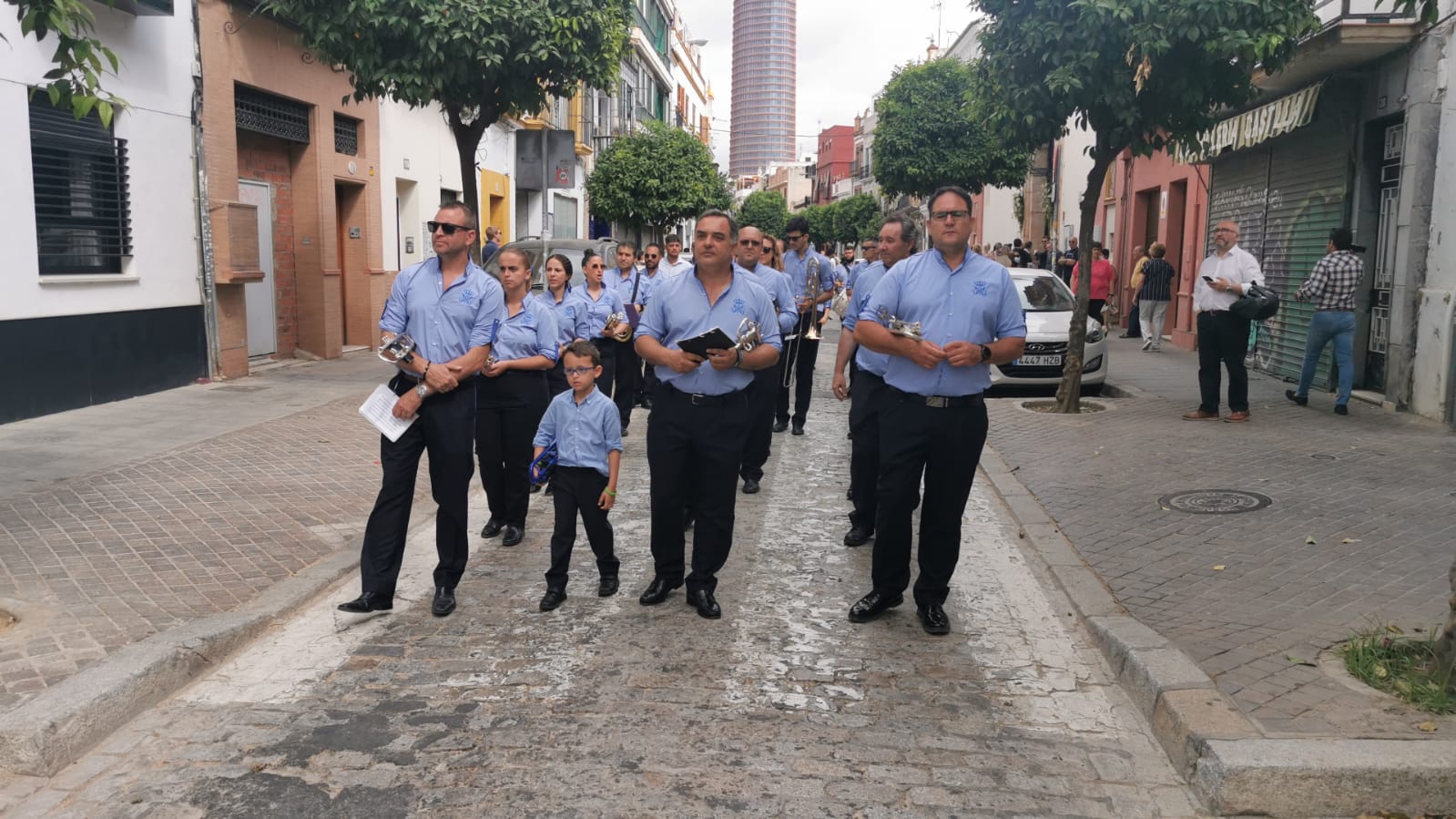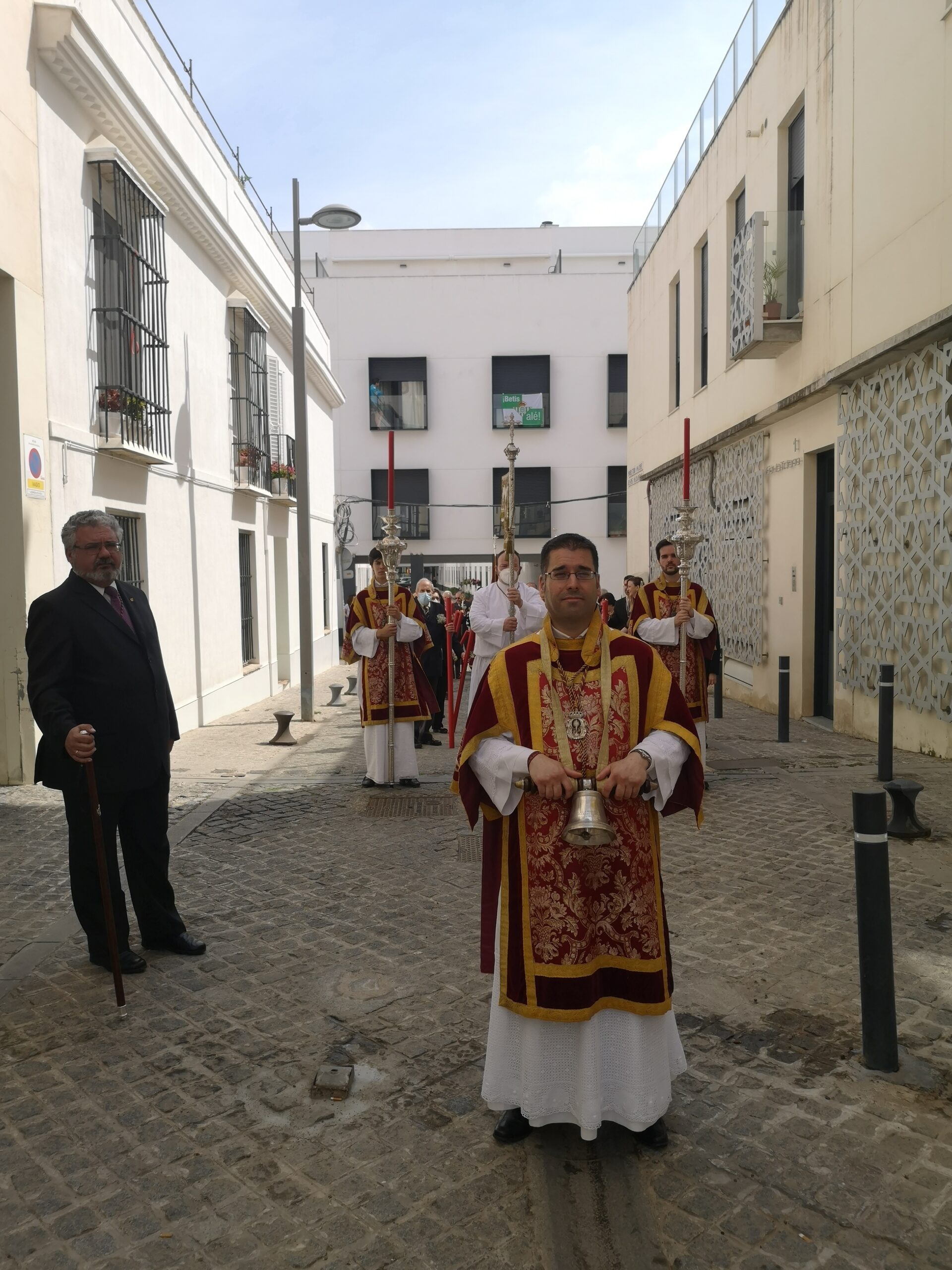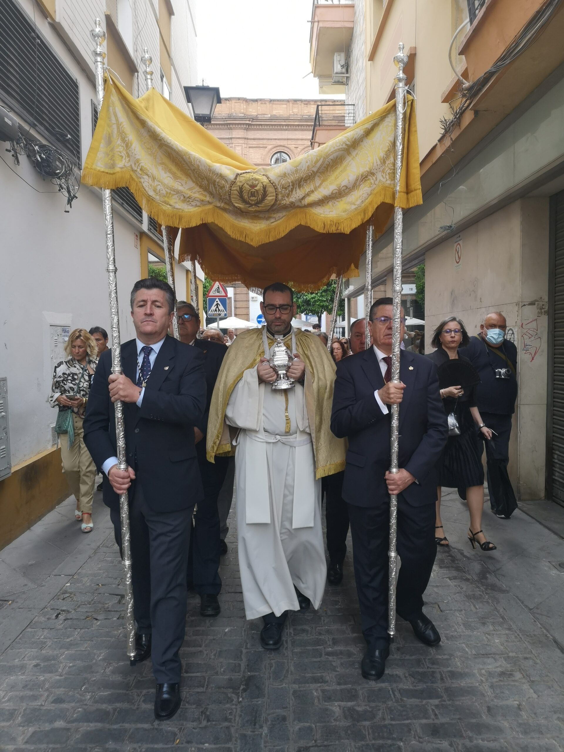 Abrió el cortejo la Agrupación Musical María Inmaculada de Castilleja de la Cuesta, que con sus sones advirtieron a vecinos y viandantes, que la procesión de Dios se acercaba. A continuación el muñidor con la campana y el guión sacramental, seguido de los hermanos y feligreses de La O portando cera roja. Cerrando este tramo del cortejo, el libro de reglas de la Archicofradía, portado por pertiguero con medallón y pértiga, acompañado de cuatro varas.