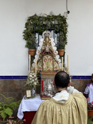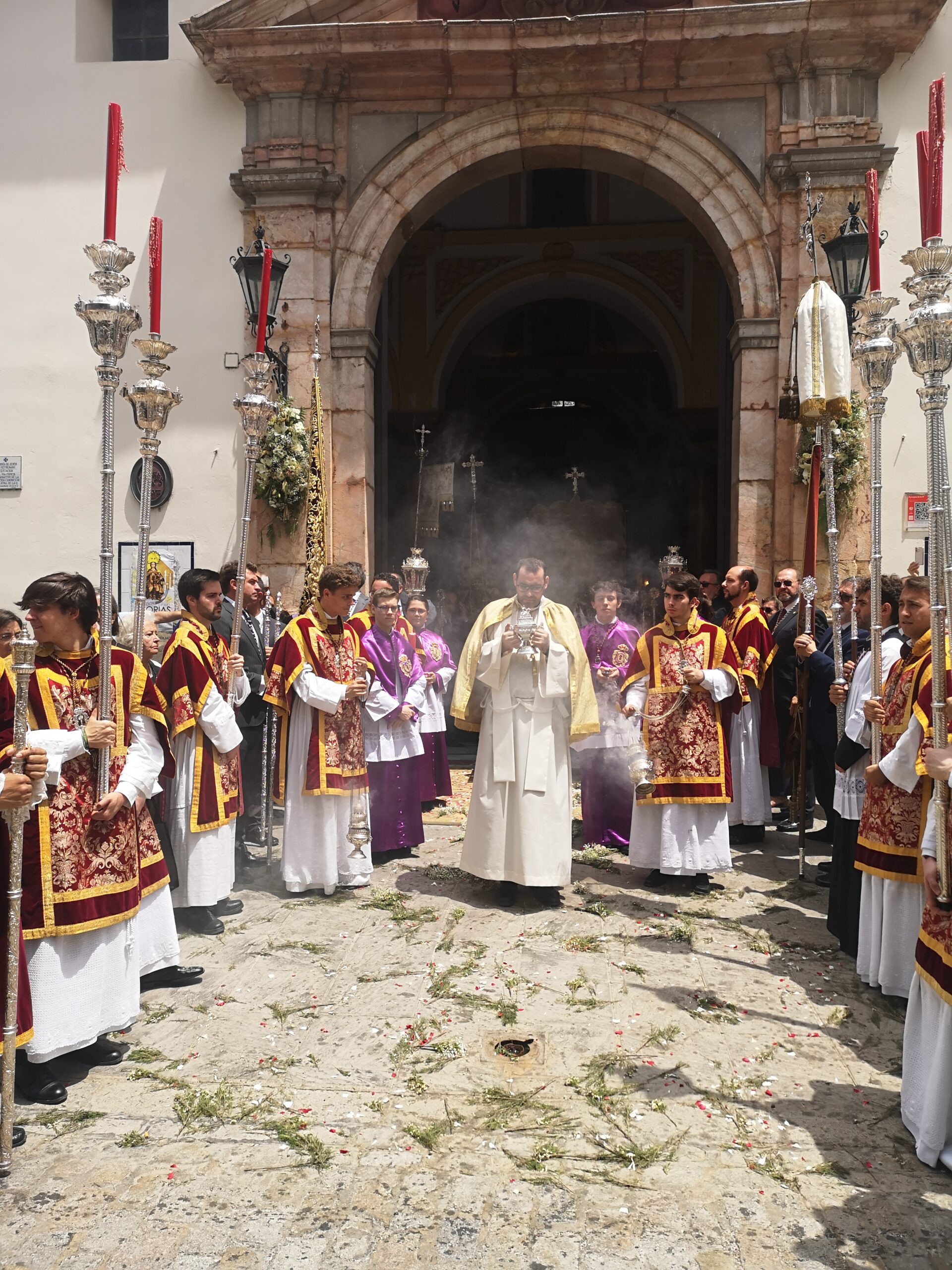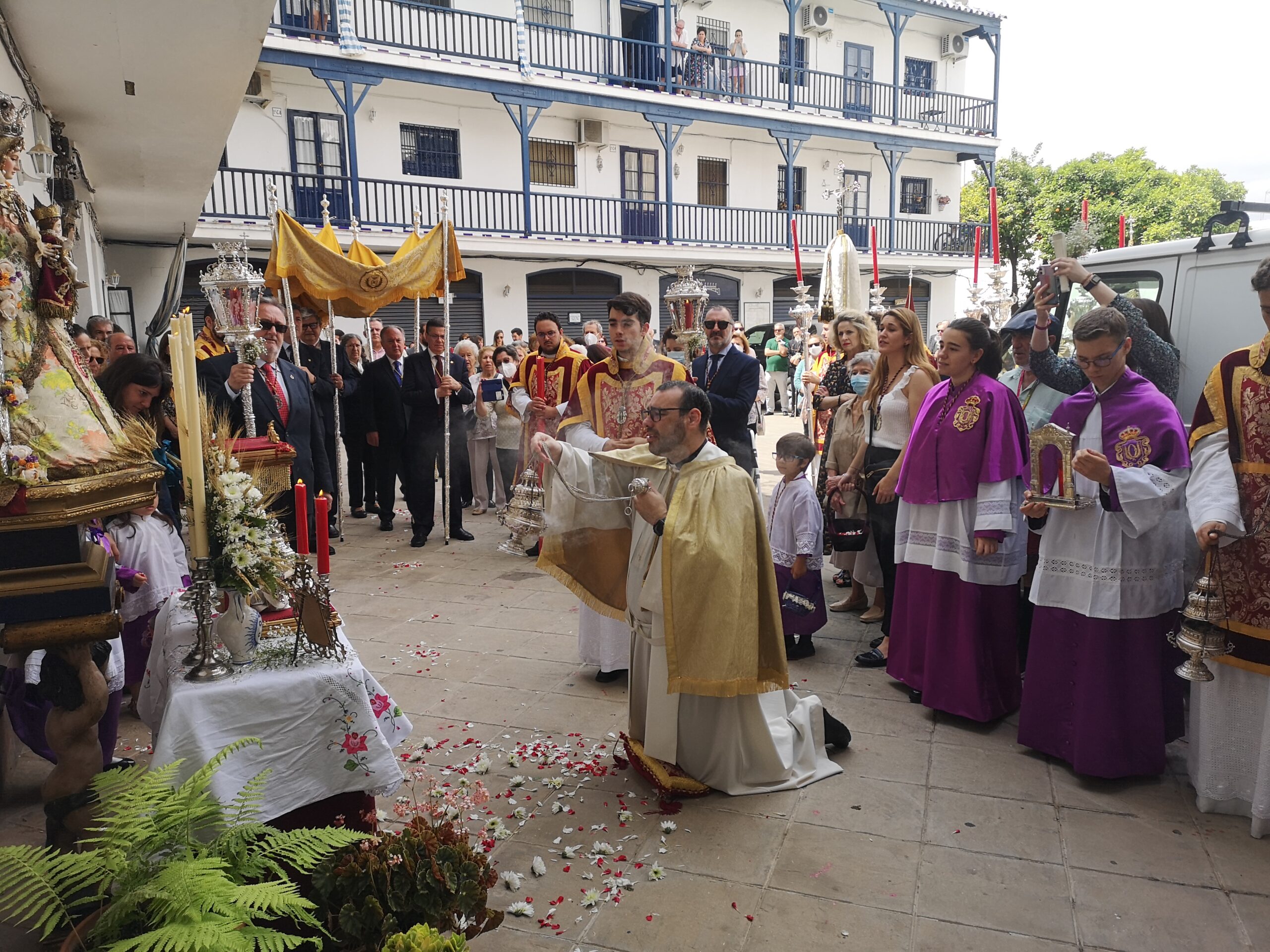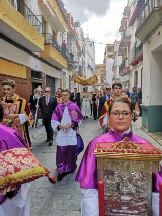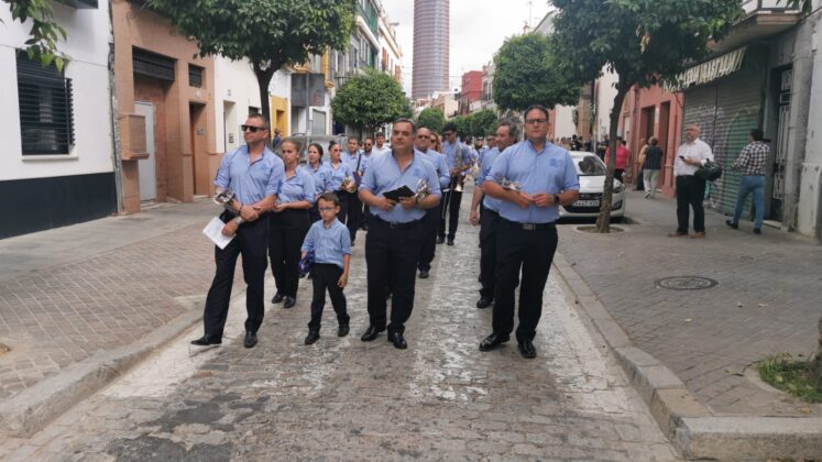 Otra forma tradicionalmente histórica que ha sido recuperada para esta primera procesión eucarística para el cumplimiento pascual de enfermos e impedidos ha sido el que los participantes en la procesión, han portado pequeños ramos de flores que han sido arrojados en la puerta del templo parroquial, conforme ha ido entrando la procesión, que ha finalizado con la solemne bendición y el desfile de la banda de música de Nuestra Señora de la Soledad de la Algaba, que con sus sones ha acompañado el discurrir de Su Divina Majestad.