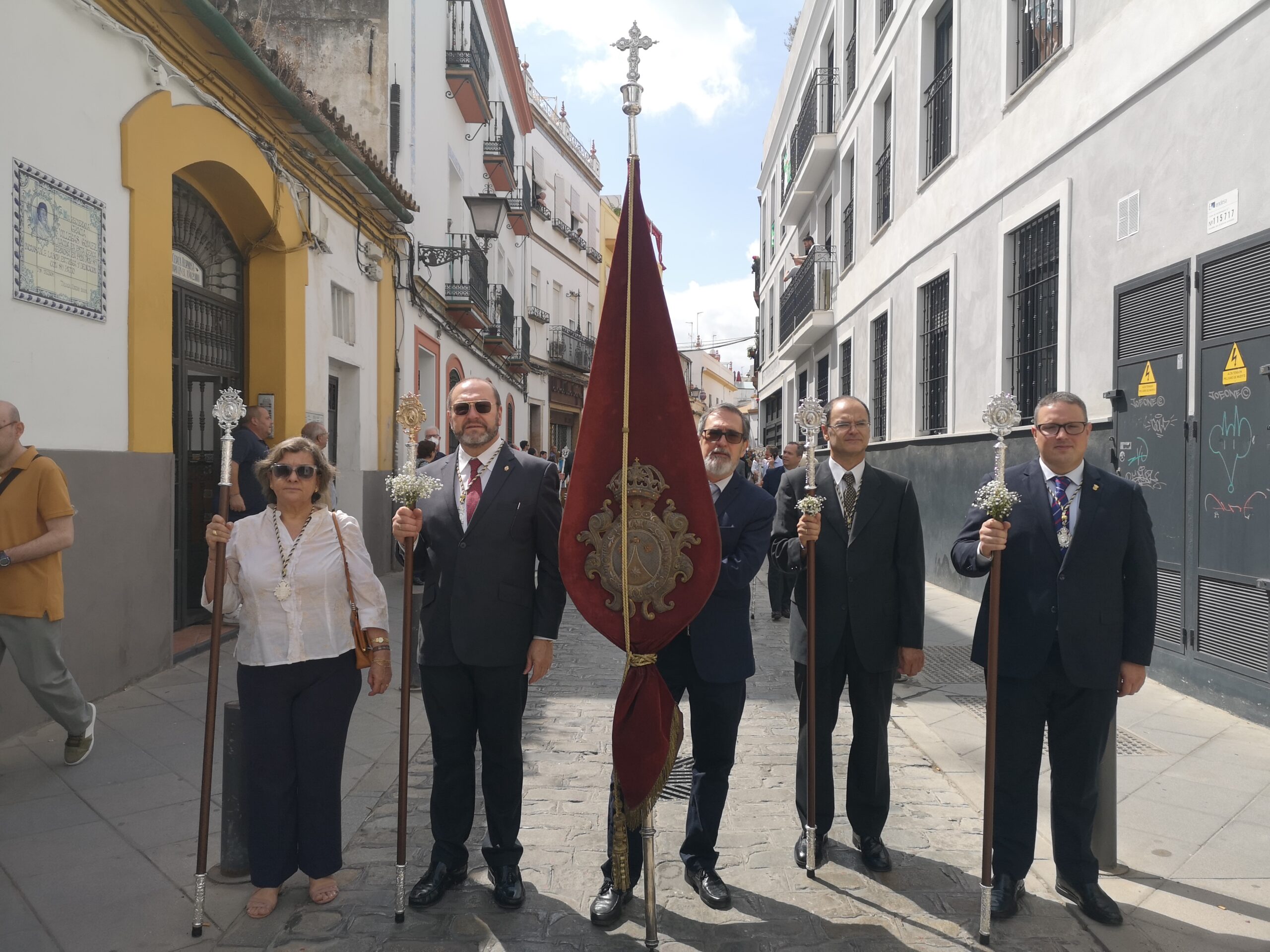 Especialmente singular ha sido la recuperación del estandarte sacramental para este cortejo. Se trata de una insignia que llevaba décadas sin uso, y que casi todos hemos conocido expuesta en las dependencias de la hermandad, y no siempre. Seguidamente, ha figurado el estandarte corporativo de la Archicofradía, acompañado de cuatro varas, y tras él la presidencia compuesta por el señor Hermano Mayor y el Teniente de Hermano Mayor con sus varas.