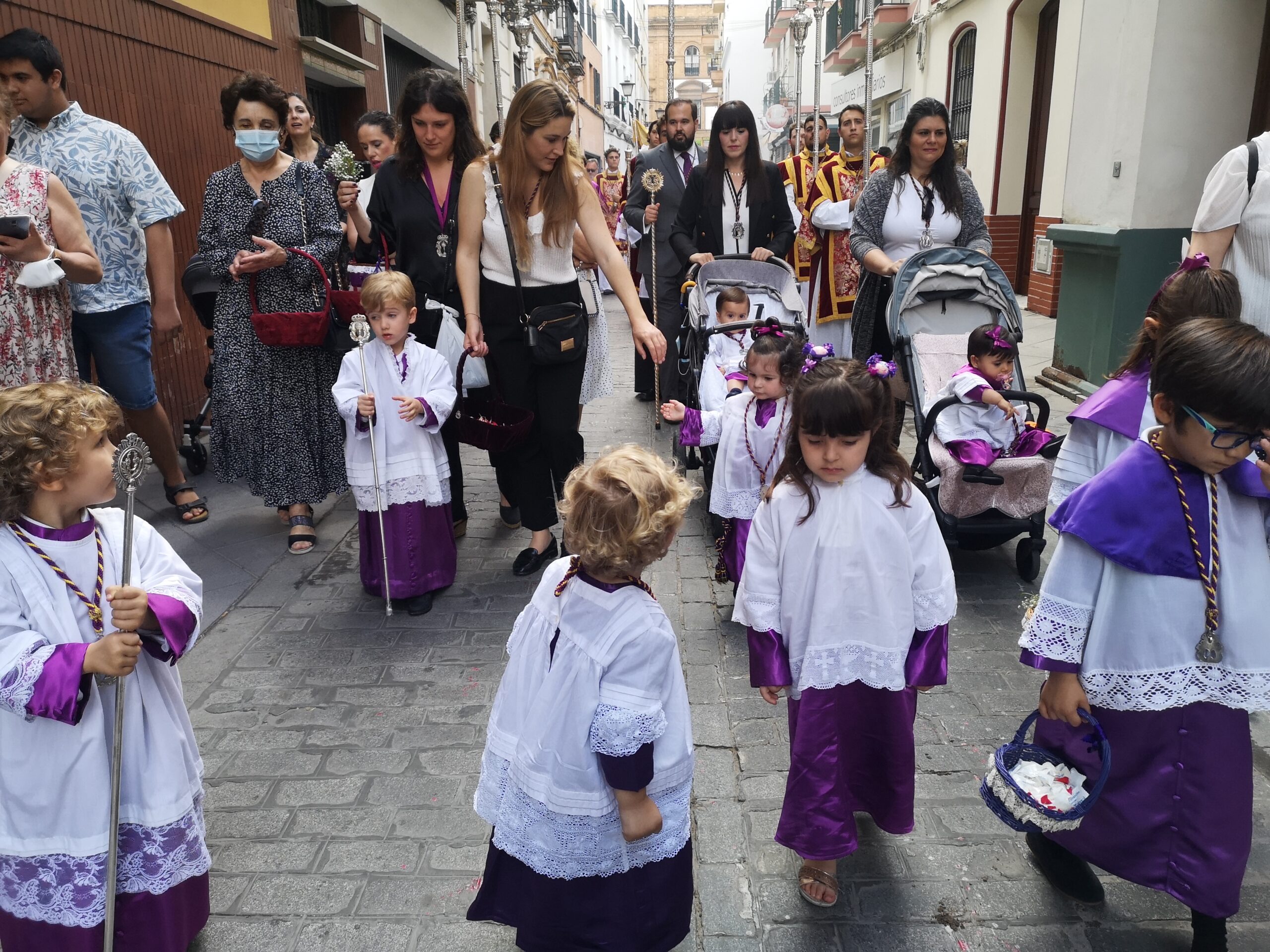 Un nutrido grupo de niños y niñas vestidos de monaguillo han precedido el cortejo litúrgico de la procesión, provistos de canastos con pétalos, que han ido arrojando al paso de Jesús Sacramentado. Seis acólitos ceroferarios, la cruz alzada y acólitos con incensarios, celados por el pertiguero con medallón y pértiga, seguidos por monaguillos con el altar manifestador portátil, cojín, campanilla y portaluz, seguidos por dos acólitos portando cera, han compuesto el cortejo litúrgico que precedía el palio bajo el que ha sido conducida Su Divina Majestad a las casas de los diversos enfermos e impedidos. Dos faroles de asta han escoltado al palio, cuyo nuevo juego de varas, en uso desde el pasado año 2021, han salido por primera vez a la calle en procesión. Un grupo de feligreses y hermanos, han acompañado al Señor tras su palio, durante todo el recorrido.