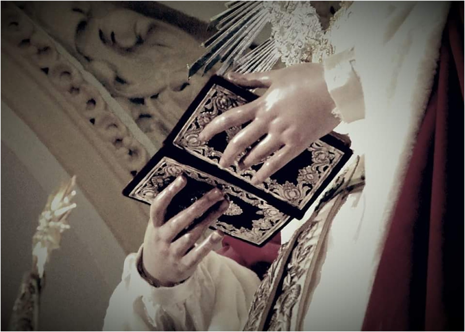 En el único retablo de la nave del Evangelio de la parroquia, Santa María de Nuestra Señora de la O porta con ambas manos, un libro con pastas de terciopelo rojo y aplicaciones de plata, que contiene las antífonas junto al Magníficat.