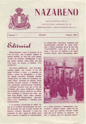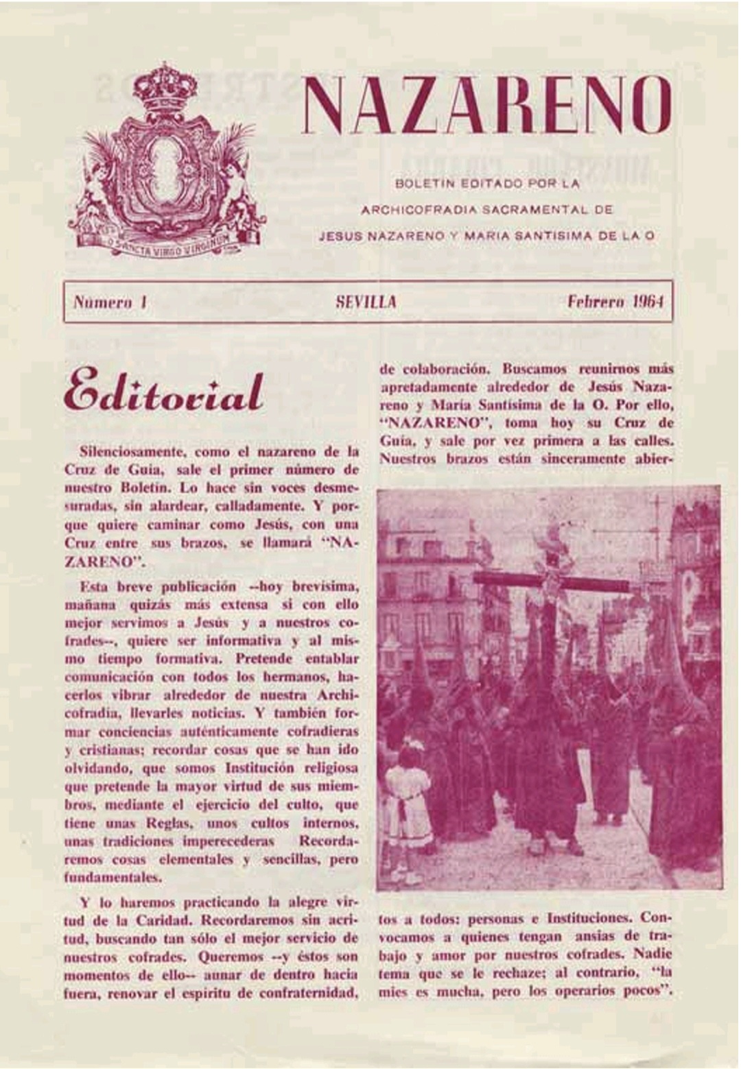 Al cumplirse el sexagésimo aniversario de la creación de nuestro Boletín, a la hora de escribir esta líneas, desconocemos el registro documental de la decisión formal de editarlo que, en algún momento, debió tomar la Junta de Gobierno de nuestra Hermandad, presida por D. Rafael Barragán Quintanilla. En ausencia del dato concreto y a falta de una revisión más exhaustiva de los fondos de nuestro archivo histórico, resulta francamente reveladora la columna titulada “Finalidad” que se publicó en el Boletín nº 2, de marzo de 1964, donde, de forma clara y concisa, quedó perfectamente plasmada la intencionalidad y motivos que dieron origen a nuestra publicación, así como en el anuncio, algo más solemne, que marcaba las líneas maestras sobre cómo vehicular esa declaración de intenciones, puestas de manifiesto en el Editorial del nº1 de febrero del mismo año. Ejemplar pionero que salió de prensas en formato periodístico, tamaño cuartilla, una tinta —morada, por supuesto— y a dos columnas; en la portada, el nombre de la publicación, “Nazareno”, Boletín Editado por la Archicofradía Sacramental de Jesús Nazareno y María Santísima de La O, grabado del escudo corporativo de la Hermandad, fotograbado con imagen del discurrir de la Cruz de Guía y sus nazarenos morados por el Altozano, el Editorial y una inscripción que quedará para siempre marcada en nuestra memoria: Nº1, Sevilla, Febrero 1964; al interior: 3 páginas con la misma organización y técnicas, conteniendo los artículos y secciones creadas ex novo, sin firmas, con insertos publicitarios de algunos negocios del barrio, los créditos de la empresa contratada, Imprenta San Antonio, Carlos Cañal, 30, Sevilla y el Depósito Legal, SE-41-1964.
