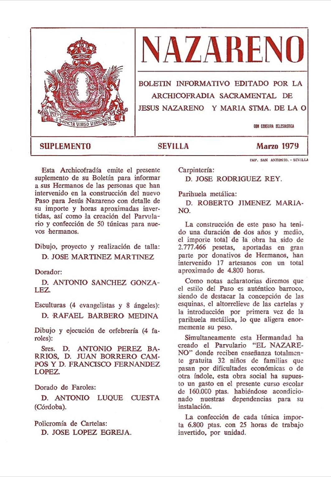 La primera edición se le encargó a Imprenta San Antonio —hoy, Gráficas San Antonio—, empresa del centro de Sevilla referente en el ámbito de las artes gráficas, establecida en la calle Carlos Cañal, 30 y posteriormente en Almansa, 7, especializada en el sector de la edición cofrade. En una primera etapa, produce nuestro Boletín de manera ininterrumpida hasta el nº 22 (marzo-abril 1979), cuando se contrata a Imprenta Escandón, que hace tres ejemplares. En diciembre de 1981 retoma la edición, ahora con nueva razón social, Gráficas San Antonio, para un solo número. Las empresas Ruiz Megalrejo y J. de Haro se reparten la impresión entre diciembre de 1982 y septiembre de 1988, siendo a partir del nº 39 (diciembre 1988) hasta nuestros días, de nuevo Gráficas San Antonio. En total se han publicado 121 números de “Nazareno”, tres boletines extraordinarios con motivo de la Coronación Canónica de María Santísima de La O (2005, 2006, 2007) y tan solo un curioso suplemento, de una hoja, al nº 22 de marzo de 1979, dedicado a informar a los hermanos sobre los artistas que intervinieron en la construcción del nuevo paso de Cristo, sus costes y horas de trabajo, la creación de un Parvulario como nueva obra social y la confección de 50 túnicas de nueva factura.