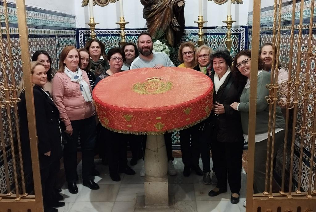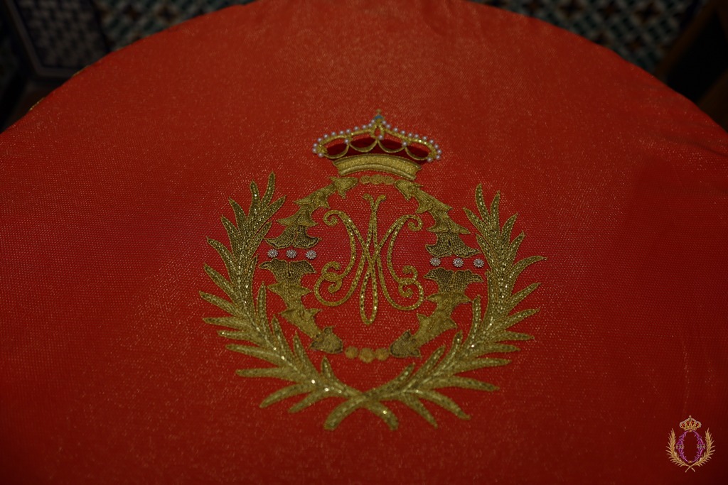 La pieza ha sido bordada durante los últimos meses por el taller de iniciación al bordado que desde hace varios cursos se viene desarrollando en nuestra casa de Hermandad y al que asisten un nutrido grupo de hermanos y hermanas de la Archicofradía.