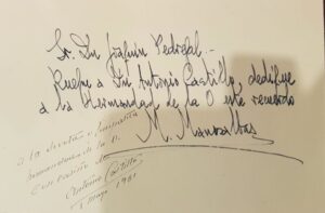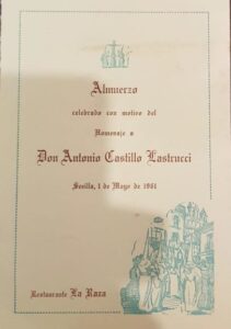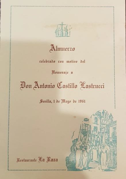 Siendo consciente pues toda la sociedad de la magnitud de su obra y gran talla humana de Castillo Lastrucci, al final de su vida comenzaron a llegar los merecidos reconocimientos. Las cofradías de Sevilla acuerdan celebrar un homenaje en su honor que tendría lugar el día 1 de mayo de 1961. Para ello promueven un almuerzo fraternal en el restaurante La Raza de nuestra capital, siendo una de las tarjetas-recuerdo impresas para la ocasión, manuscrita al reverso por los protagonistas de nuestro relato, el documento objeto de estas líneas. En ella, Manuel Manosalbas, siempre inquieto y pensando en nuestra Hermandad, se dirigió a D. Joaquín Pedregal, destacado periodista que ejerció responsabilidades en “El Correo”, con especial dedicación a los temas cofradieros y a la sazón primer director del recién creado Boletín de las Cofradías del Consejo de Hermandades, para que rogase al homenajeado D. Antonio Castillo “dedique a la Hermandad de la O este recuerdo”, a lo que el octogenario maestro accedió, dejando manuscrita una sencilla pero entrañable dedicatoria junto al ruego del doctor.