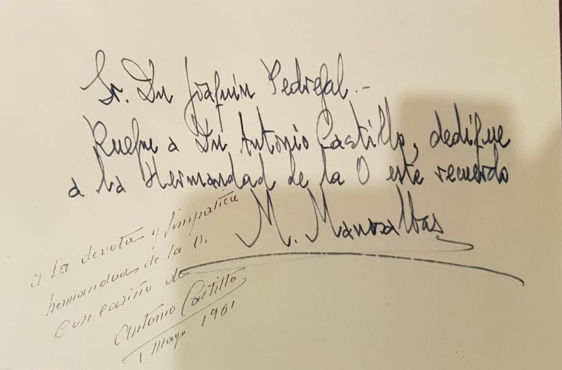 Finalmente, manifestar una vez más desde estas líneas nuestro más sincero agradecimiento a la familia Manosalbas por su aportación, tan sencilla como reveladora a poco que se hurgue en la memoria colectiva. De la misma forma ─permítannos la licencia─, agradecer a título póstumo a D. Antonio Castillo Lasrucci su entrañable y cándida dedicatoria, en la cual otorga “nuevos títulos” a nuestra corporación, siendo por su mano desde el 1 de mayo de 1961, además de Pontificia, Real e Ilustre Archicofradía, “la devota y simpática Hermandad de La O”. Como decía Rafael Díaz y ha quedado demostrado, los documentos son fuente inagotable de noticias curiosas y enseñanzas ejemplares. Larga vida a los archivos.