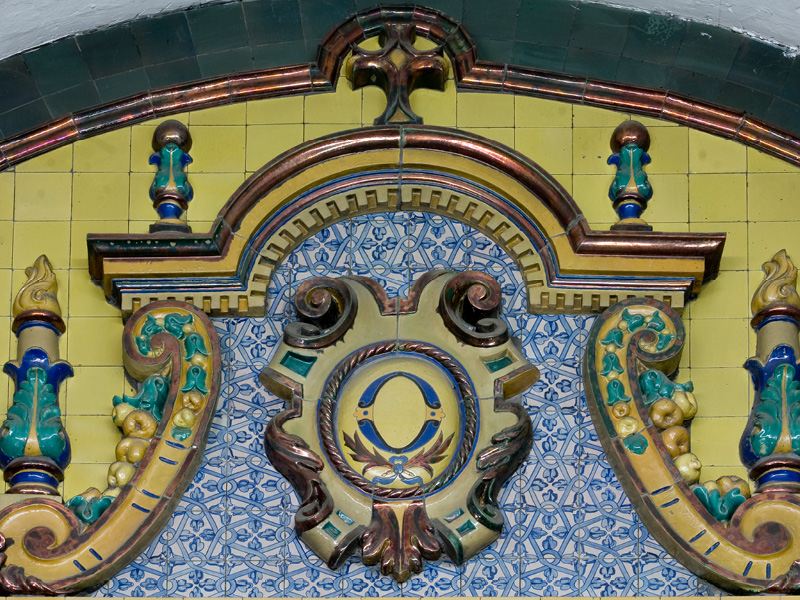 El camarín, igualmente revestido de azulejos con vidriado metalizado, es una hornacina rematada en medio punto. El primer cuerpo se remata con una amplia cornisa con frontón curvo, roto y enroscado que alberga el ático, consistente en un edículo con remates que cobija una tarja con el escudo de La O. Se trata, en suma, de un conjunto plenamente imbuido de la estética regionalista, no sólo por los repertorios decorativos empleados, sino también por la utilización de la cerámica artística como elemento fundamental y casi único de este conjunto.