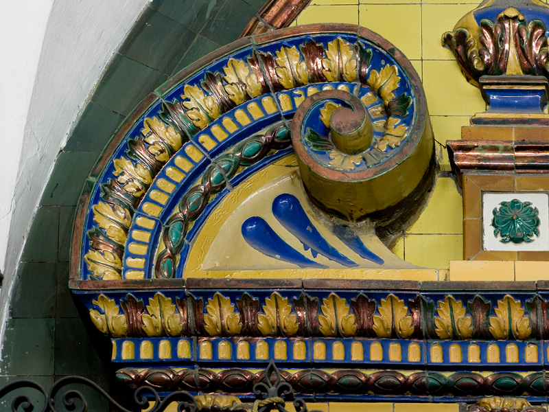 Todo el zócalo se organiza en tres registros: sobre el rodapié en cobalto liso se dispone una faja decorativa con roleos vegetales en tonos verdes, azules y dorados sobre fondo amarillo, un registro central donde se desarrolla la mayor parte de la iconografía, y una nueva banda superior donde vuelven a aparecer los roleos, esta vez con la concurrencia de niños alados, de elegante diseño. Centrando la atención en la faja central, en las jambas del ingreso se colocan las efigies de cuerpo entero de San Pedro y San Pablo, representados de pie y según la iconografía tradicional.