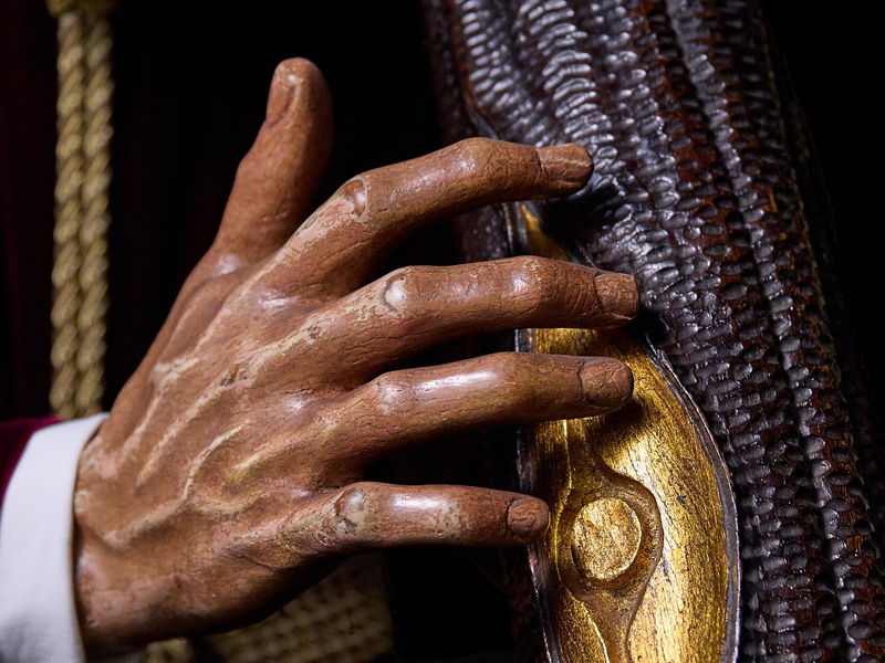 “Ítem quinientos reales que dió a Pedro Roldán por la hechura de un santísimo Cristo entero de la cruz a cuestas en madera. Ítem quatrocientos que dió a Parrilla de encarnar el santísimo Cristo. Ítem sesenta reales que dió por la cruz en madera para el santísimo Cristo. Ítem cincuenta reales que dió de dar color y dorar la cruz” (Extracto de las cartas de pago del libro de cuentas del prioste Antonio Ramos Mejías a finales de 1686, en relación a la hechura del Señor).
